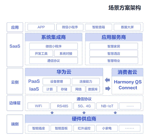 甚至家用电器也变得越来越智能。LG、海尔、美的等公司制造了洗衣机、干衣机甚至冰箱,现在可以通过语音助手和手机app进行控制。以华为云IoT为例,智慧生活物联网场景整体设计包括硬件设备、云上资源、平台服务和业务应用。其中云上资源由华为云提供服务,平台服务由开源鸿蒙OpenHarmony、华为云IoT服务以及合作伙伴提供,业务应用由合作伙伴基于华为云开放的能力服务构建。从SaaS侧、端侧、云侧提供解决方案给用户提供越来越完善的居家生活体验。