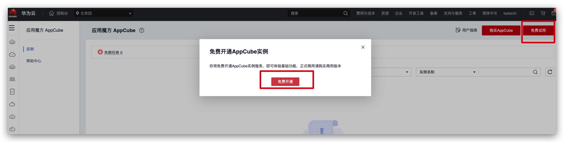 订购AppCube免费版 ,点击页面右上角“免费试用”,完成购买。