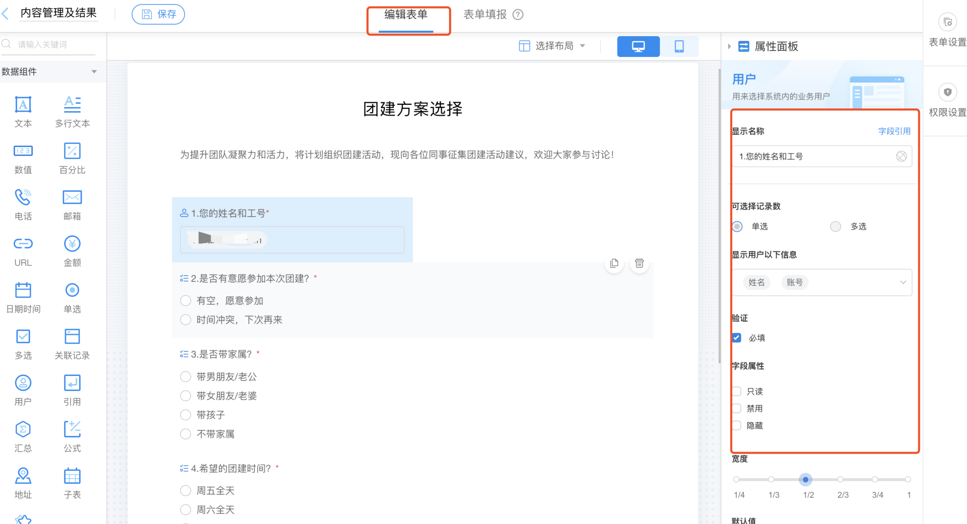 左边为组建模块,可以随意拖到到表单中,之后在右边可以对组件属性进行按需设置,非常简单。