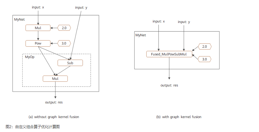 该计算图的融合结果如图2所示,其中左图为未使能图算融合时的对应计算图,右图为使能图算融合后的对应计算图。可以看到不仅自定义算子MyOp中的基本算子进行了融合,并且与主图中的其他算子也进行了更大范围融合。该融合过程可以通过查看中间IR,或者通过Profiling等工具跟踪算子执行过程进行验