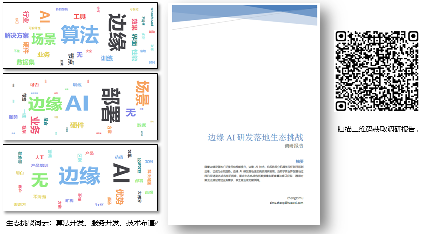 基于调研结果已发布业界首份边缘AI落地生态挑战调研报告,可通过下方二维码扫描获取。我们也绘制了三种不同角色所反馈的生态挑战词云。