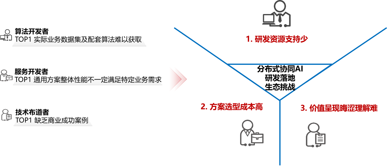 从中可总结出核心痛点:业务数据集及其配套算法难以获取,同时封闭测试环境难以跟上各类新业务孵化。同时看到第一个需求:分布式协同AI标准数据集和配套算法管理与下载,快速上手真实业务。