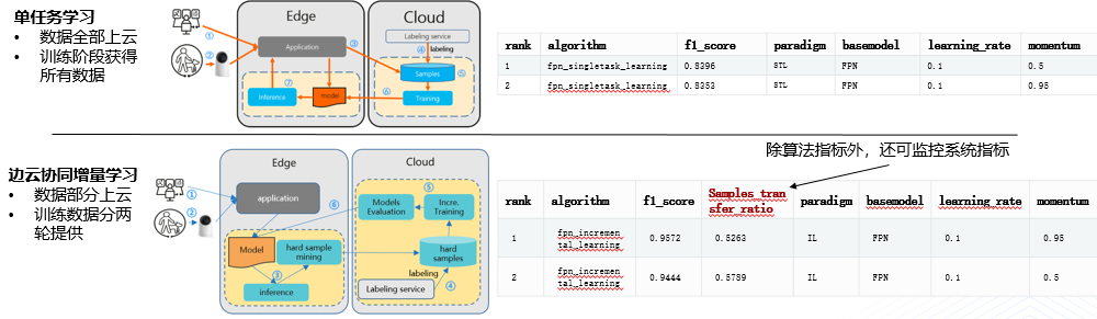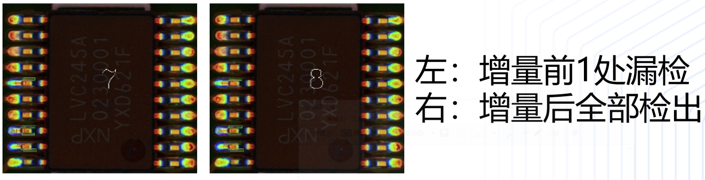 基准测试结果显示,待测FPN算法F1性能在0.84-0.95波动。边云协同增量学习可节省近50%的上云数据量,同时获得10%以上的精度提升。如下图所示,增量前1处漏检:仅检出7处,增量后全部检出:检出全部8处缺陷。