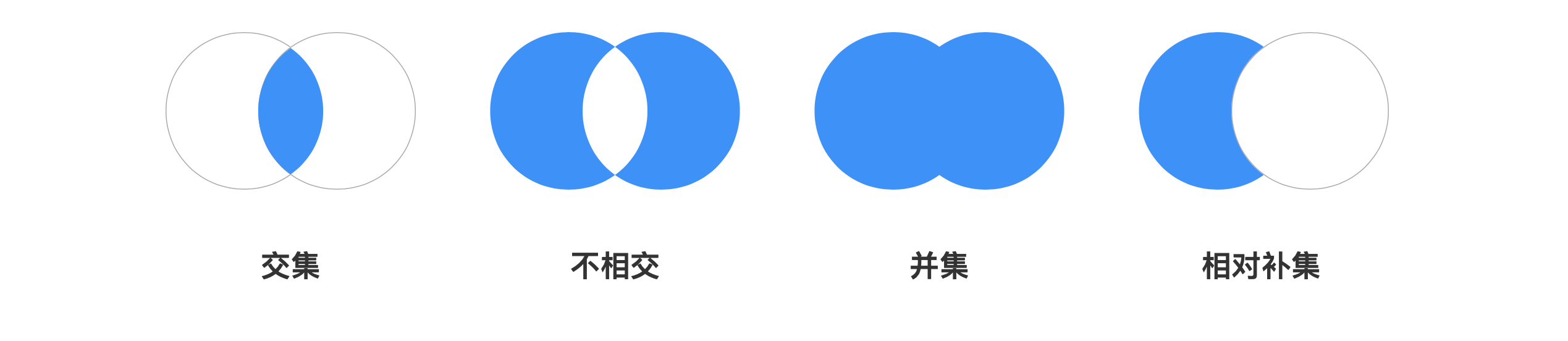 在高中还是大学的时候,我们也学习过集合的相关操作:交集、不相交、并集、相对补集、子集。