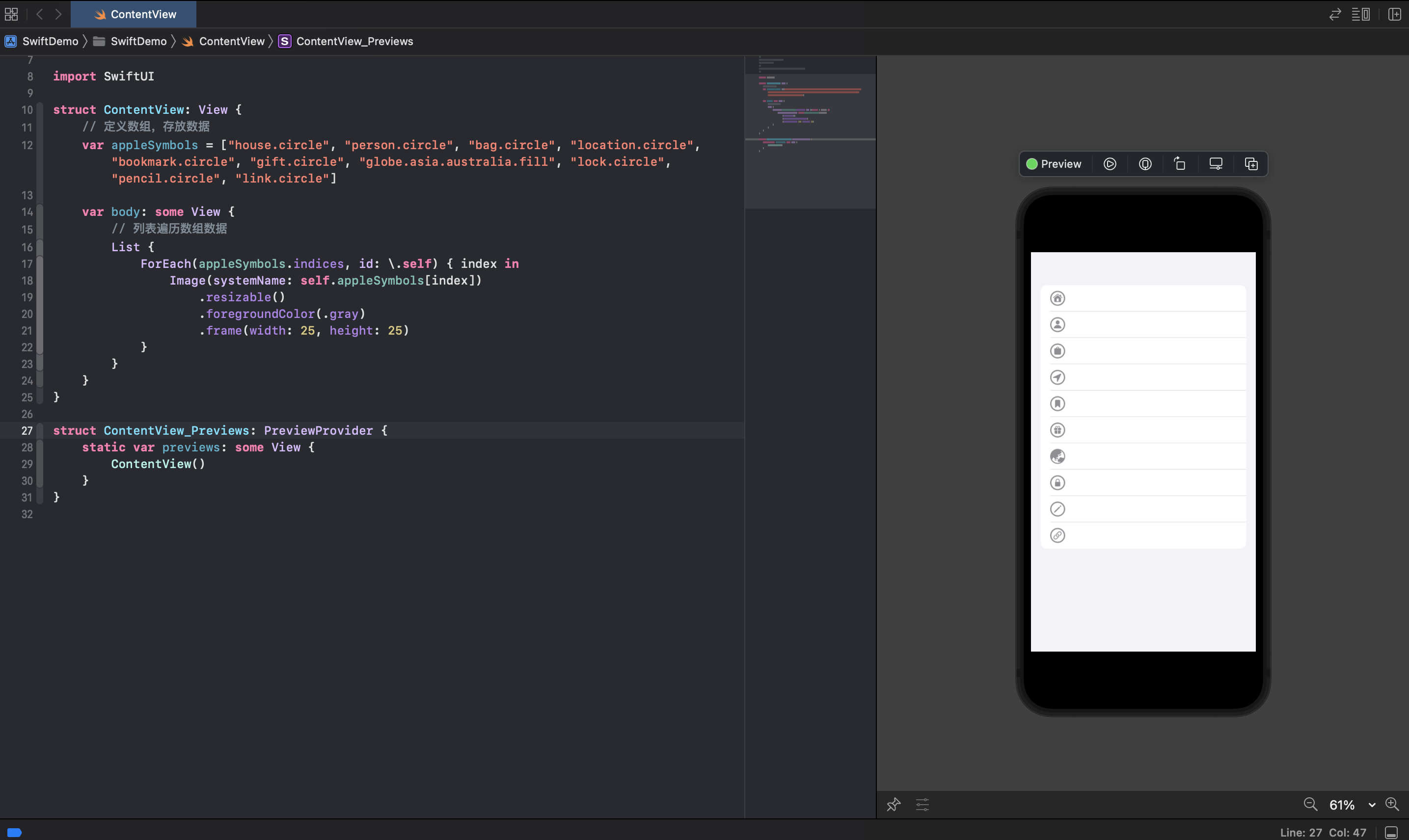 然后,我们使用了List列表和ForEach循环的方法遍历appleSymbols数组中的数据,在ForEach循环方法中,我们用.indices获得数据的范围,appleSymbols.indices等同于0..appleSymbols.count。