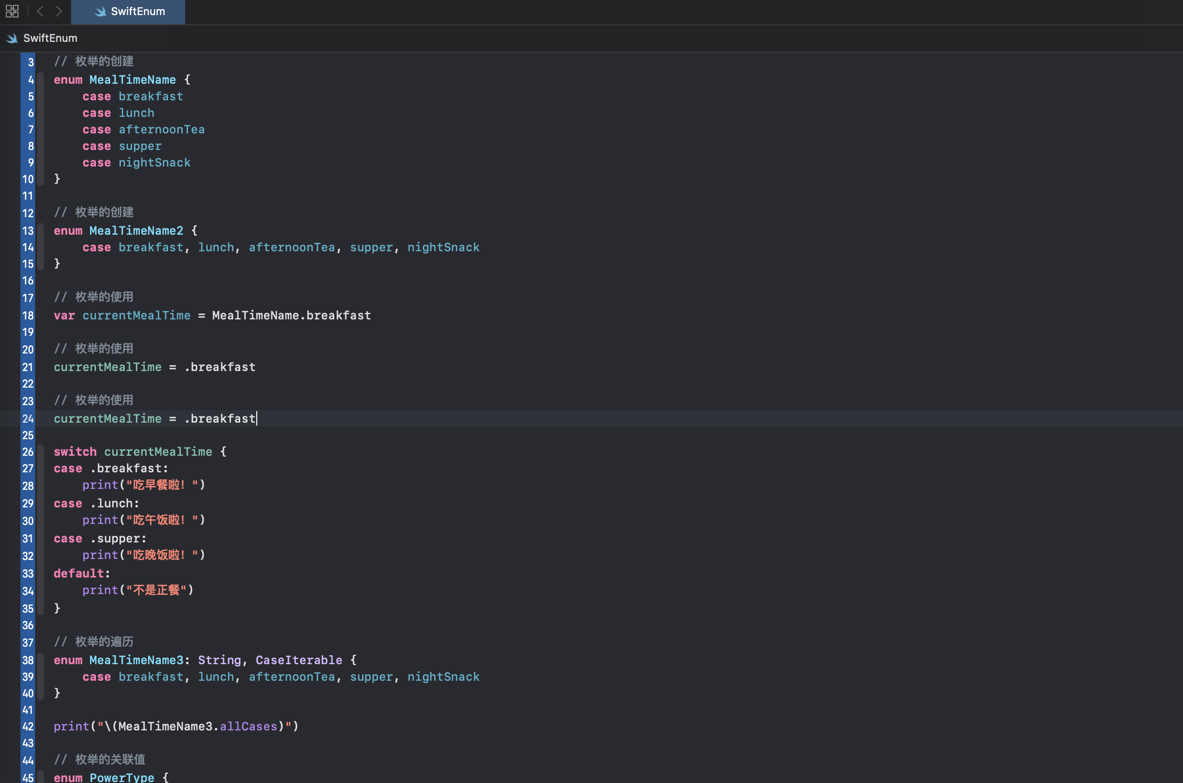 上述代码中,我们定义了一个MealTime餐段的枚举,我们使用case在这个枚举里定义了5个枚举的成员值。