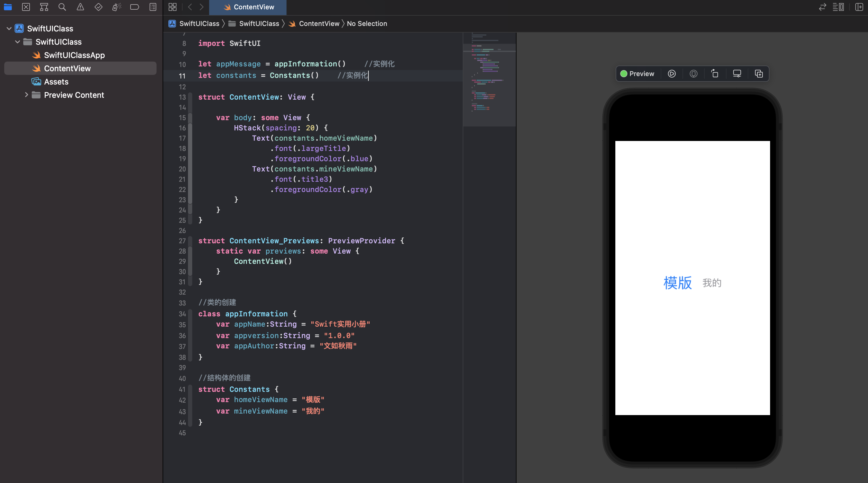 上述代码中,我们定义了一个Constants结构体,它有2个常量成员值:homeViewName、mineViewName,我们赋予了成员属性的初始值。