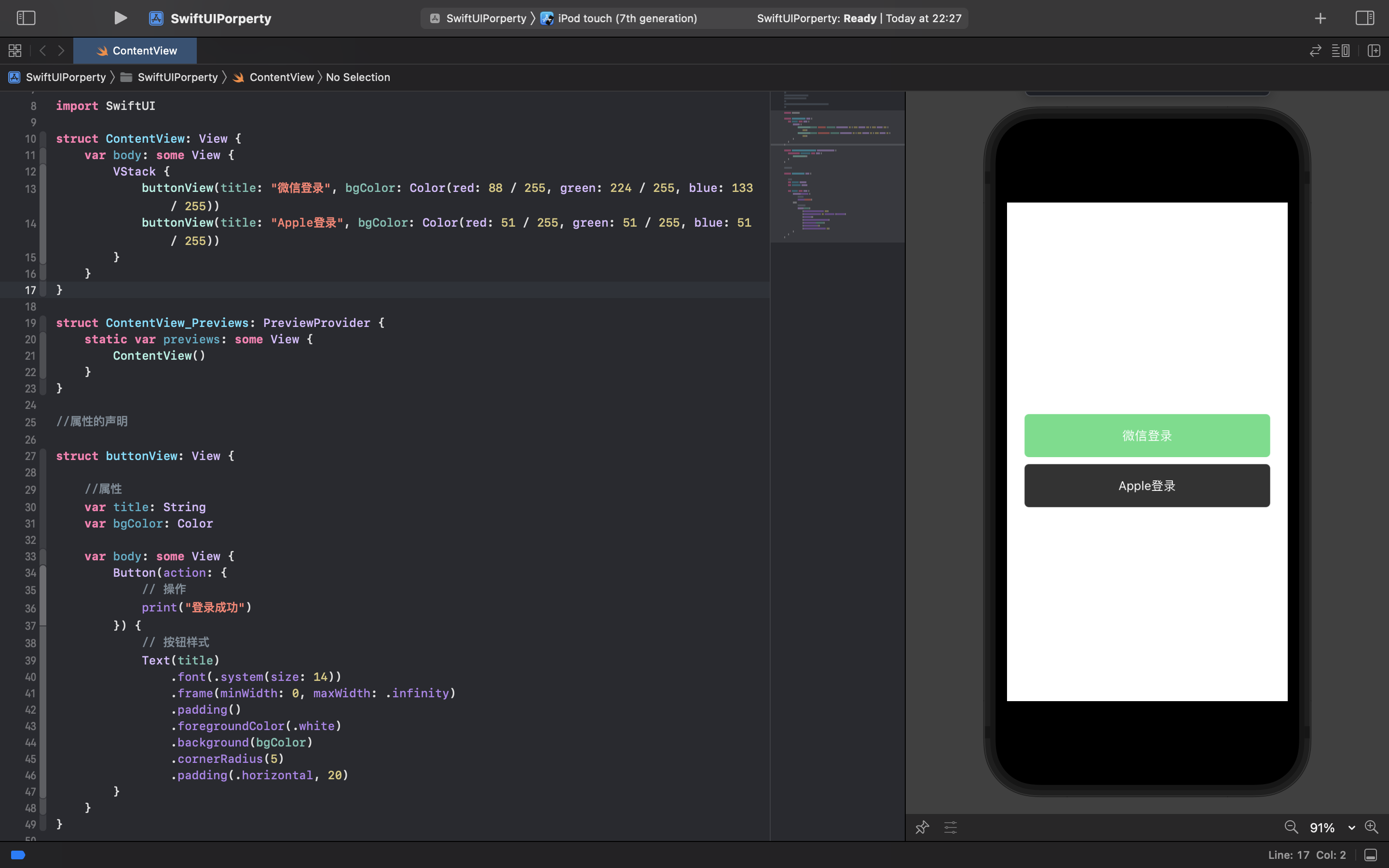 上述代码中,我们在使用buttonView结构体的存储属性时,通过赋予属性类型的值的形式,在ContentView结构体中展示了buttonView结构体所涵盖的内容。