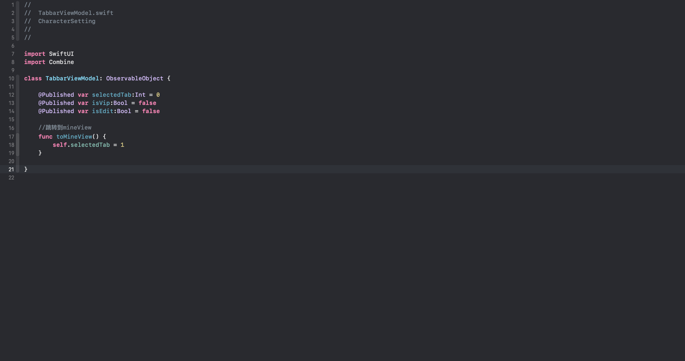 上述代码中,我们定义了一个TabbarViewModel类,它遵循ObservableObject协议。在TabbarViewModel类中,我们声明了三个变量:selectedTab、isVip、isEdit。我们给三个变量赋予了类型属性和初始值。