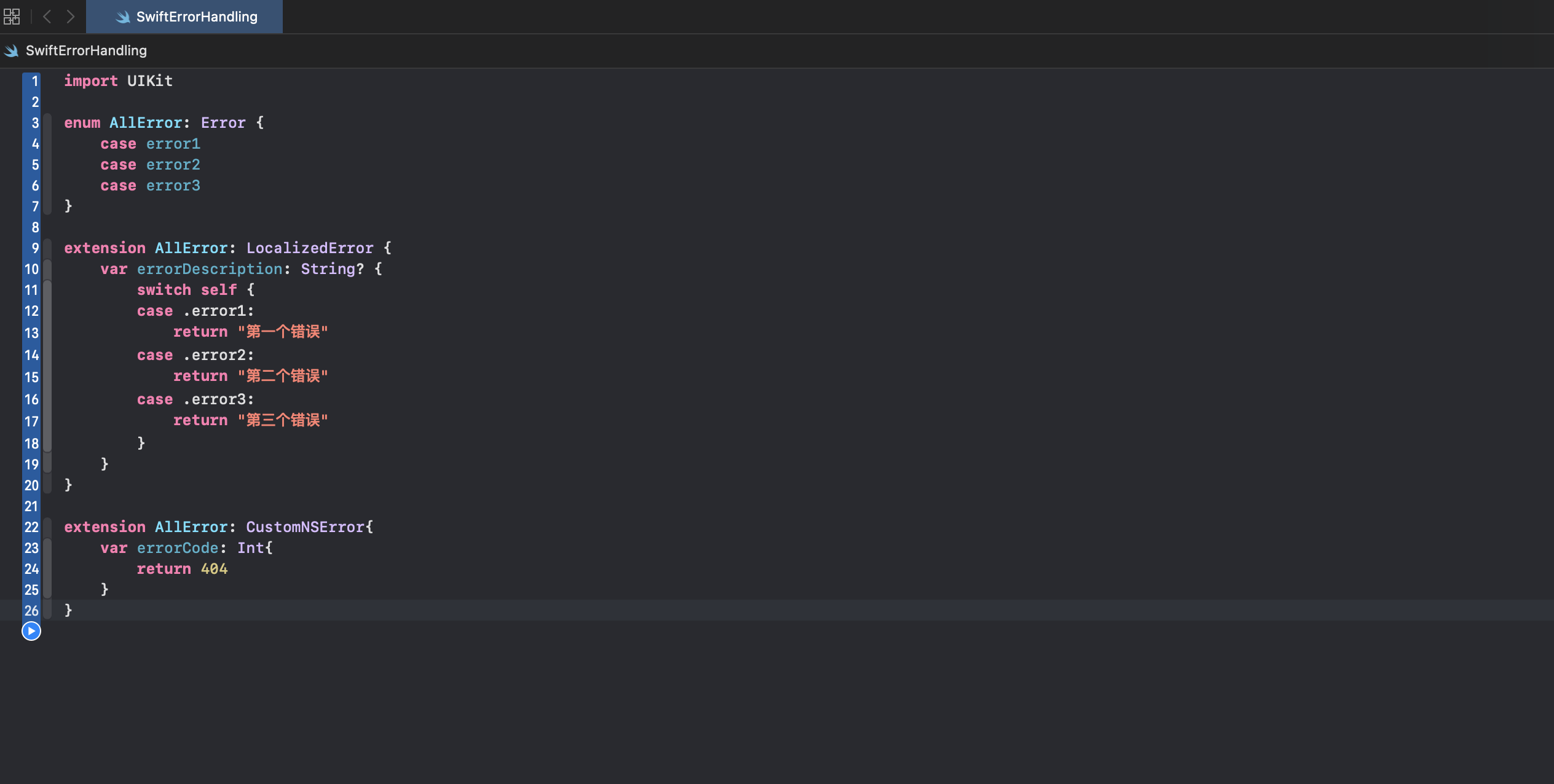 上述代码中,我们拓展了AllError枚举,它遵循LocalizedError协议。