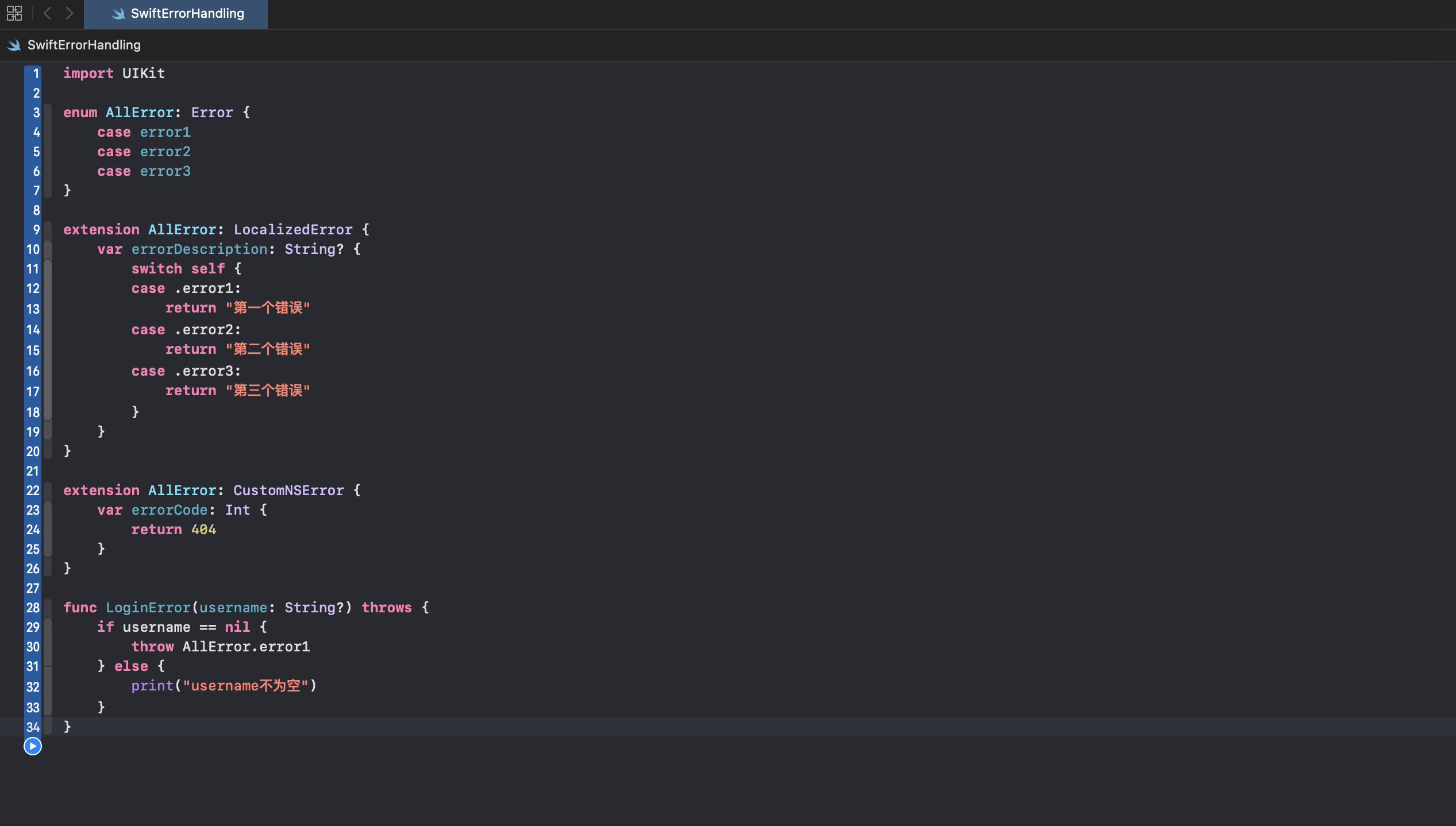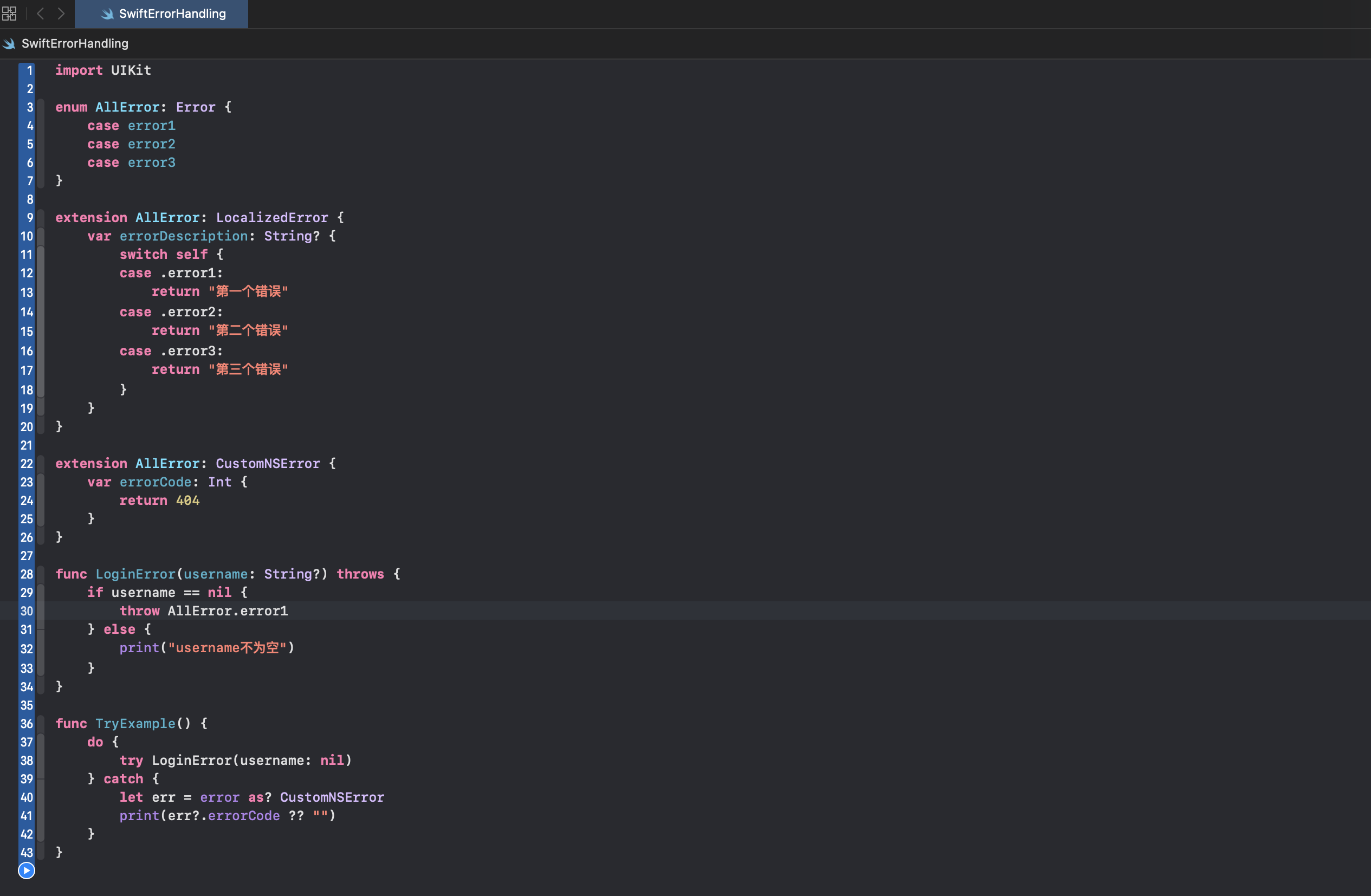 上述代码中,我们创建了一个AllError的枚举,它遵循Error协议。Error协议是Swift语法中,我们抛出错误时,错误情况的枚举类型需要遵守自 Error 协议。