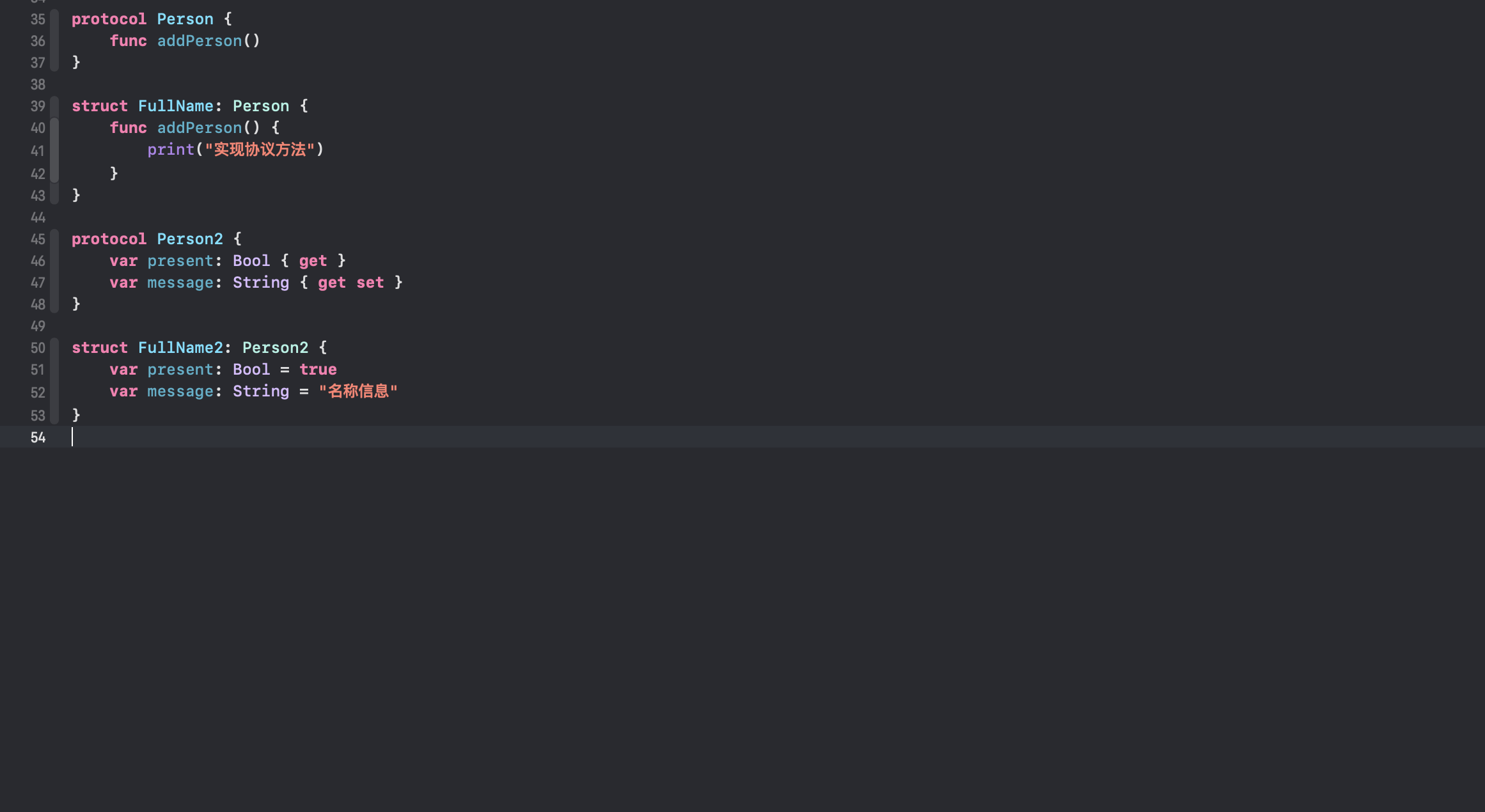 上述代码中,我们创建了一个Person协议,在Person协议内我们定义了一个方法。