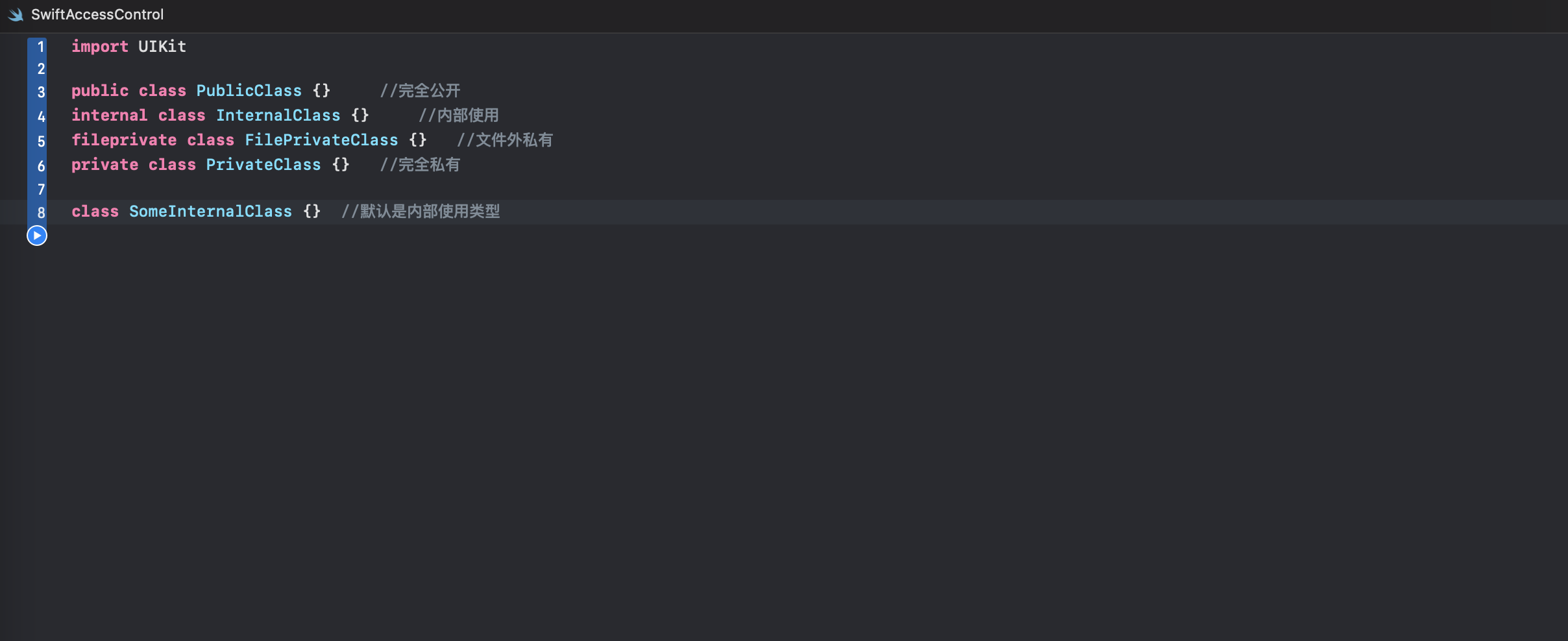 我们可以通过修饰符public、internal、fileprivate、private来声明实体的访问级别。示例: