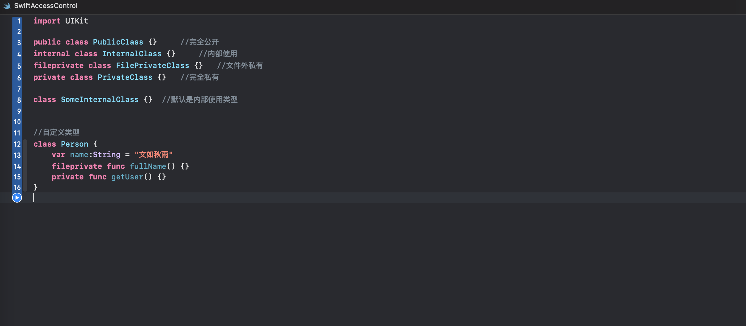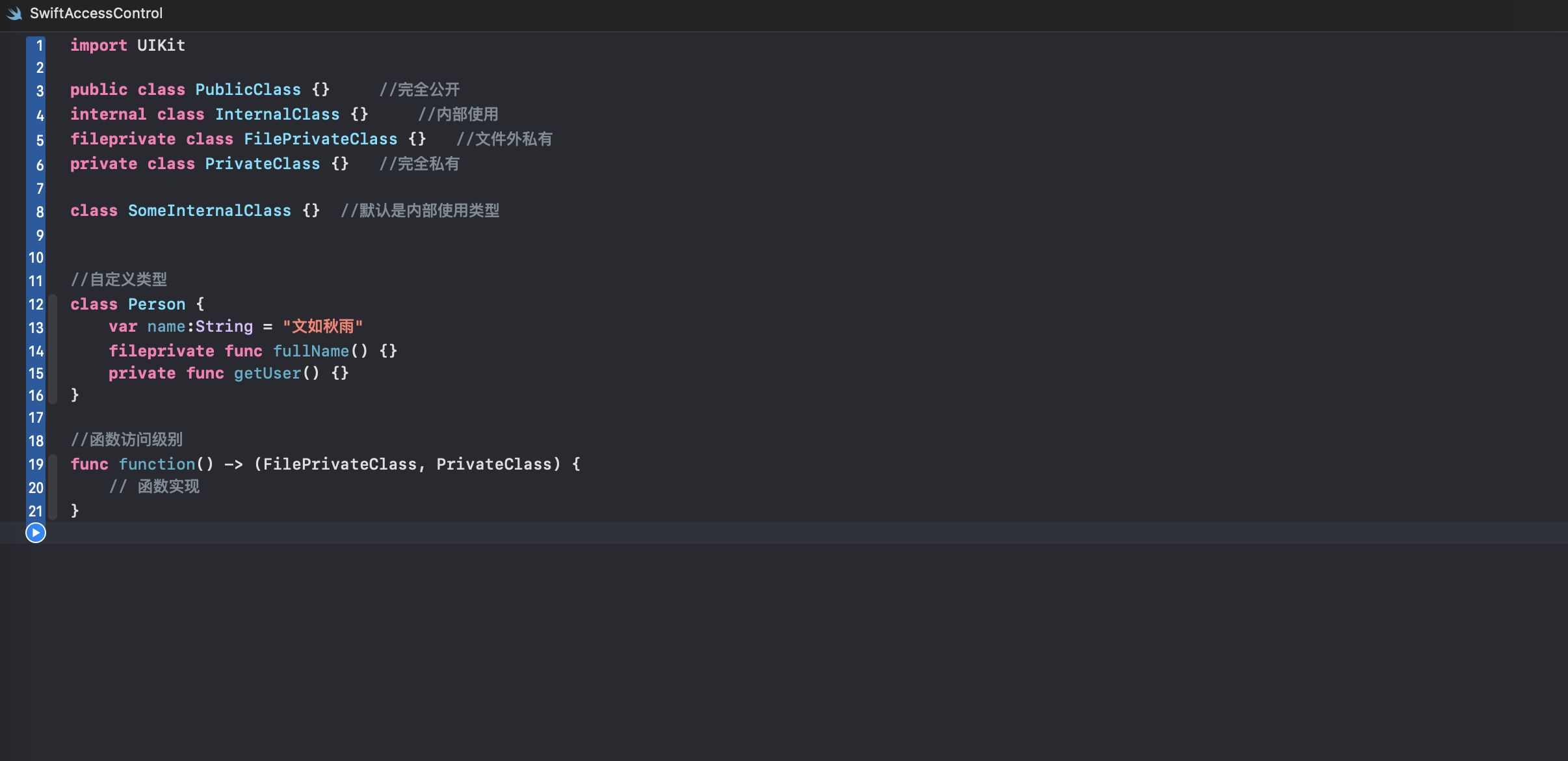 然后我们定义了一个fileprivate访问级别的方法fullName,和一个private访问级别的方法getUser。
