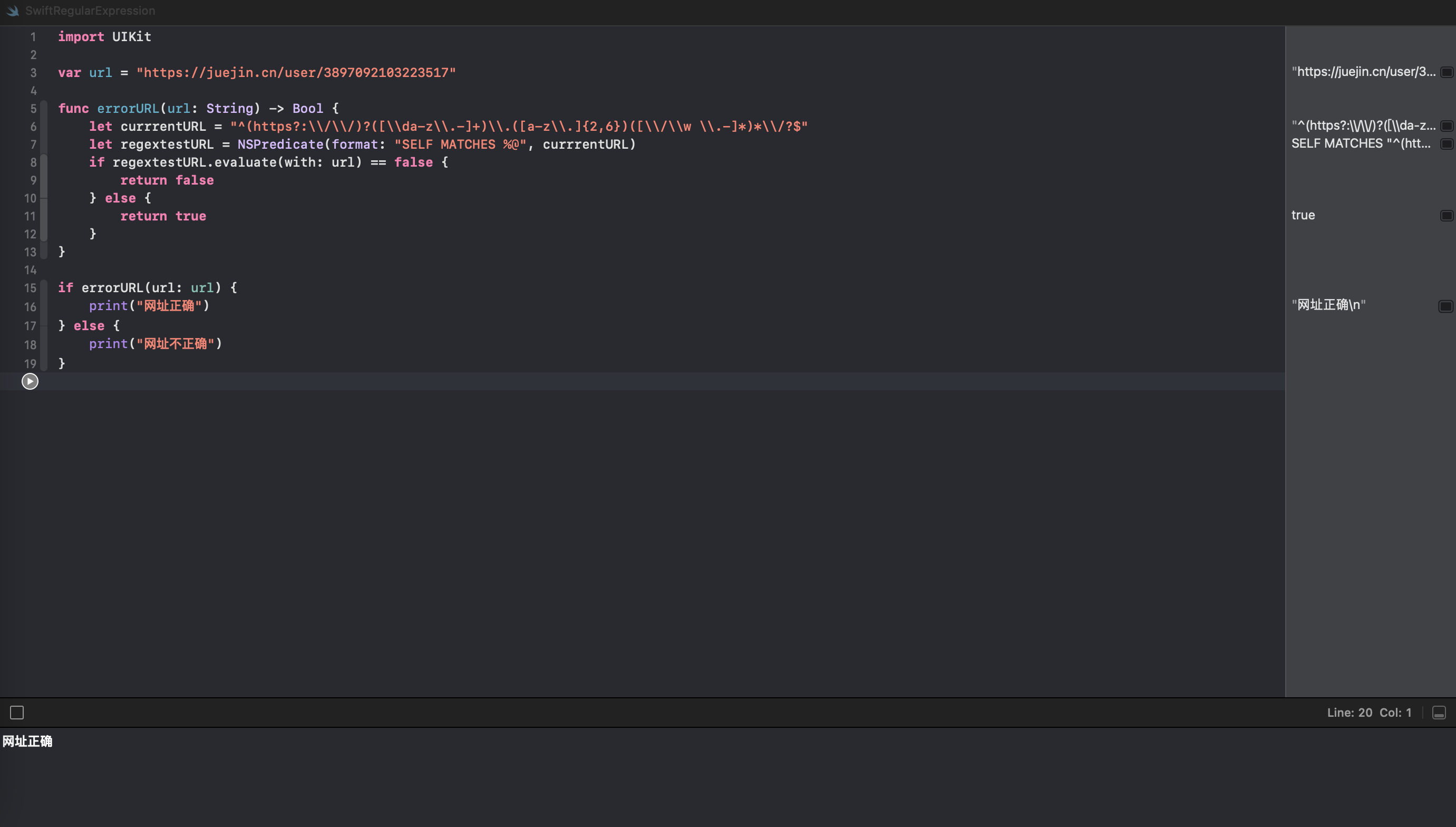 在方法内,我们定义了一个网址地址的正则表达式currrentURL,然后我们通过NSPredicate关键字对接收到的url和currrentURL正则表达式做匹配,如果匹配成功,则返回true,如果不成功,则返回false。