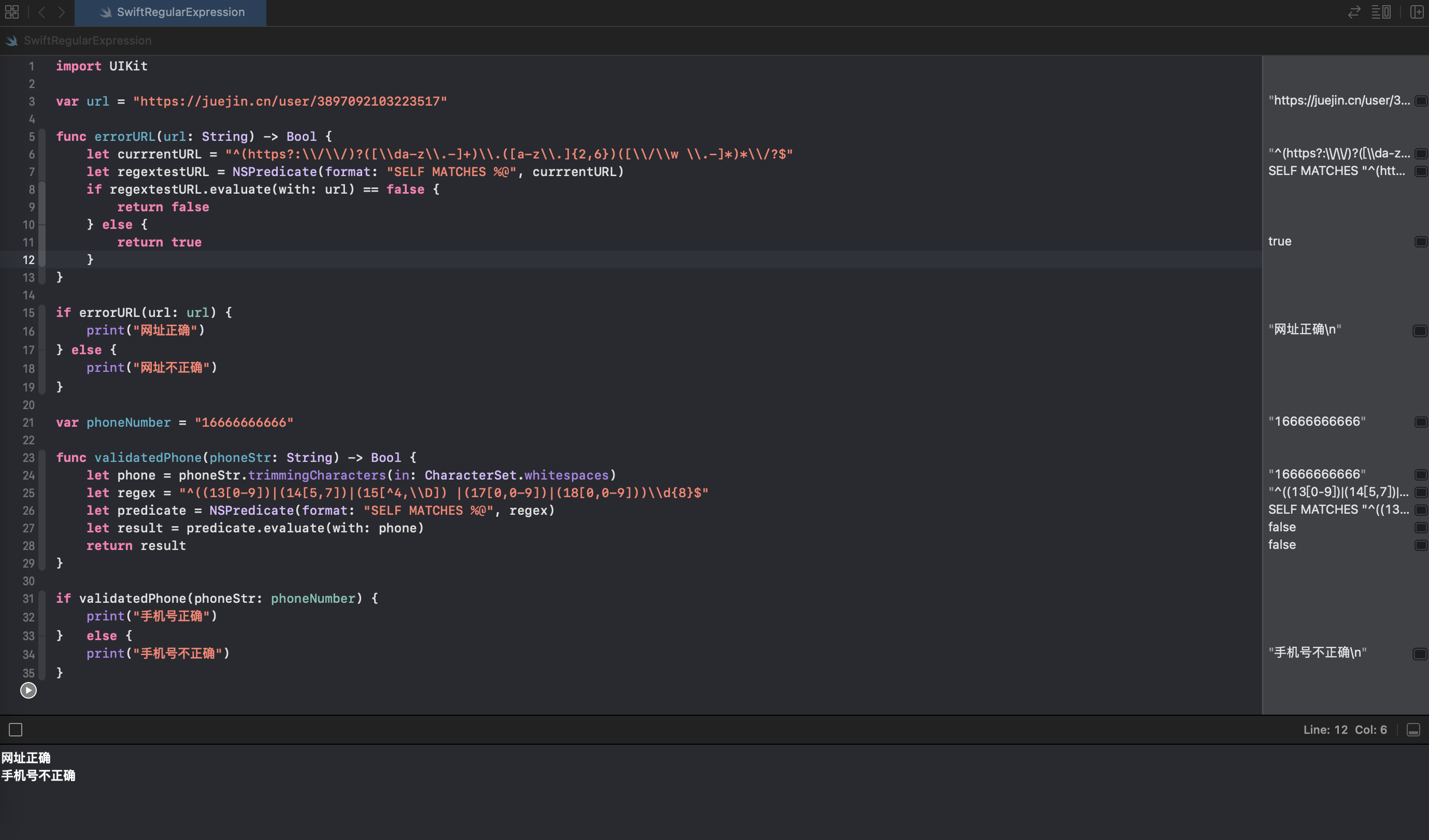 这里我们使用的正则表达式regex的规则为使用“|”分开,我们判断常用的三大运营商的手机号规则,然后我们通过NSPredicate关键字对接收到的phoneStr和regex正则表达式做匹配,如果匹配成功,则返回true,如果不成功,则返回false。