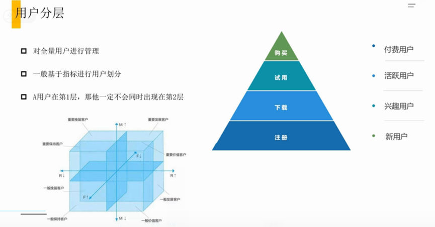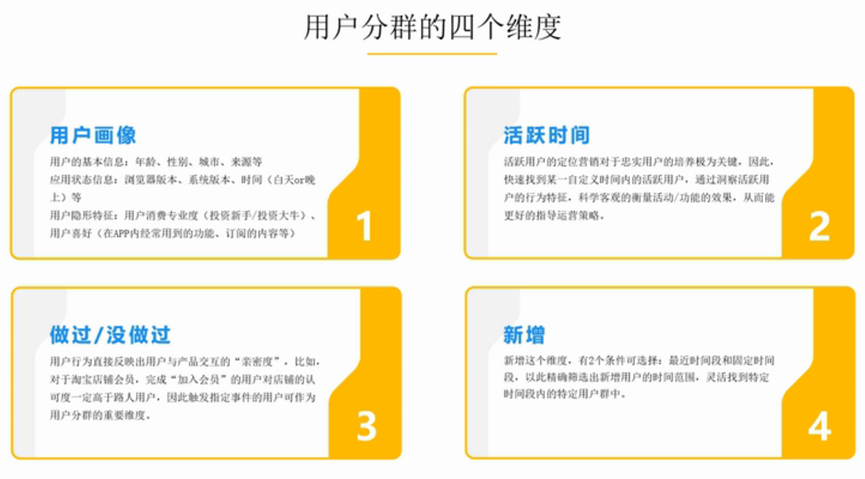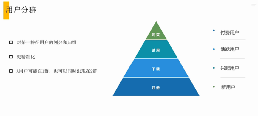 由于产品的推广运营活动的进行,用户的留存和新增数量越来越多。由于群体特征不同,行为会有很大差别,因此产品运营人员希望可以根据历史数据将用户进行划分,将具有一定规律特性的用户群体进行归类,进而再次观察该群体的具体行为,找到产品问题背后的原因,并有效改进优化方向。对用户进行精细化运营,这就是用户分群的原理。