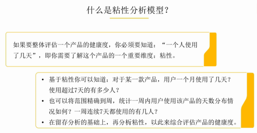 粘性分析是在留存分析的基础上,对一些用户指标进行深化,除了一些常用的留存指标外,粘性分析能够从更多维度了解产品或者某功能黏住用户的能力情况,更全面地了解用户如何使用产品,新增什么样的功能可以提升用户留存下来的欲望,不同用户群体之间存在什么样的差异,不同用户对新增的功能有何看法。