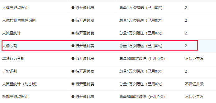 本案例的实战需求是对图片进行抠图,每日请求量为 100,来源依旧是好友求助,既然日请求量不大,那某智能云的人像分隔接口就可以使用了,申请之后,其赠送了 10000 次,每秒限制 2 次请求,足够使用。