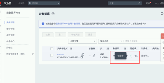 创建实例过程中,状态显示为“创建中”,此过程约5~9分钟。单击 刷新列表,可查看到创建完成的实例状态显示为“正常”。