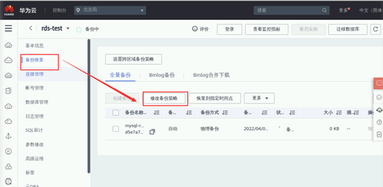 在数据库详情中,点击左侧菜单中的【备份恢复】,在备份恢复页面中,点击【修改备份策略】,可在弹窗中根据所需修改备份策略。