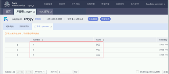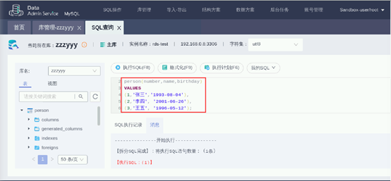 通过SQL语句在该表中插入数据,此处以刚才创建的person表格为例:点击person表的右侧【SQL查询】按钮进入查询页面。页面左侧菜单中,库名选择person所属的数据库名称。清空SQL语句输入框中的默认内容,并输入以下SQL查询语句。确认输入信息后,点击执行SQL。