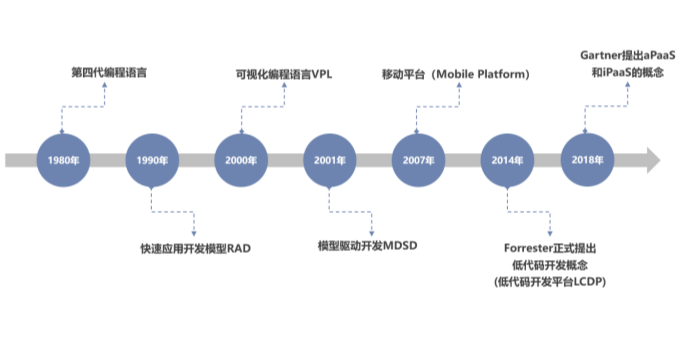低代码有很长一段自由发展期,竞争赛道模糊。2014年,Forrester提出低代码的定义,“利用很少或几乎不需要写代码就可以快速开发应用,并可以快速配置和部署的一种技术和工具。”;2018年Gartner提出和推广aPaaS和iPaaS概念,持续的技术创新让低代码受到越来越多的人关注。