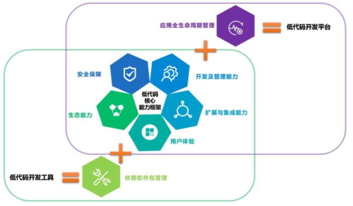报告归纳出低代码产品5大共性能力,并结合低代码开发平台和开发工具两种产品类型,形成了低代码能力框架图。