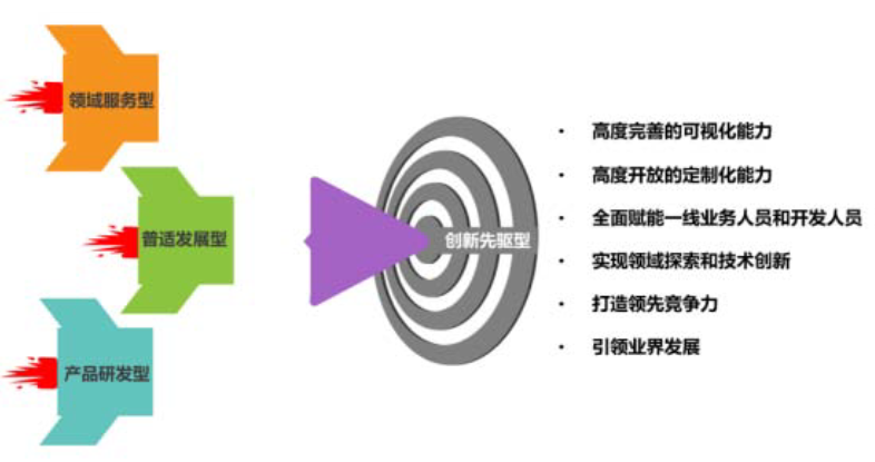 创新先驱型:指具备高度完善的可视化能力,以及高度开放的定制化能力,在赋能一线业务人员到开发人员全链路打通的基础上,能够实现新领域、新业务模式的探索,作为领域探索和技术创新的实践先驱,打造领先竞争力,引领业界发展。创新先驱型是低代码产品发展的领军者。