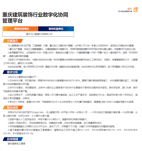 华为云作为信通院低代码•无代码推进中心成员单位之一,积极参与并推进国内低代码行业发展进程。今年5月,华为AppCube应用魔方通过“低代码平台通用能开要求评估”。除了参与白皮书编写工作外,AppCube应用魔方2个客户案例---长安汽车“低代码构建企业应用数字平台”、马上数智“重庆建筑装饰行业数字化协同管理平台”均被入选到《2022低代码·无代码应用案例汇编》。