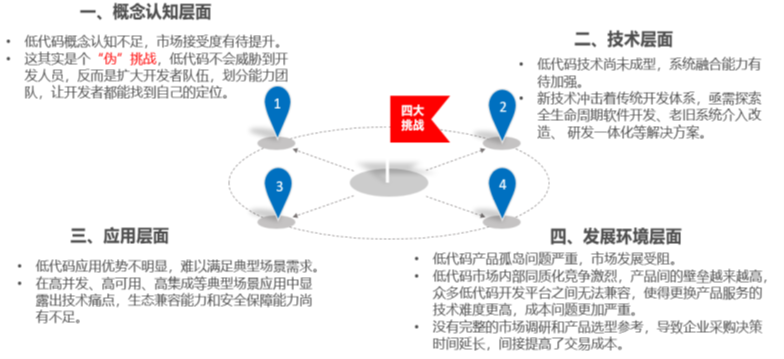 报告指出,低代码发展面临四大挑战,亟需建立低代码发展体系来指引低代码行业的发展和建设,共同构建一个市场有序、充分竞争的市场格局。低代码发展体系包括人才培养体系、标准规范体系、生态建设体系和市场推广体系四个方面。
