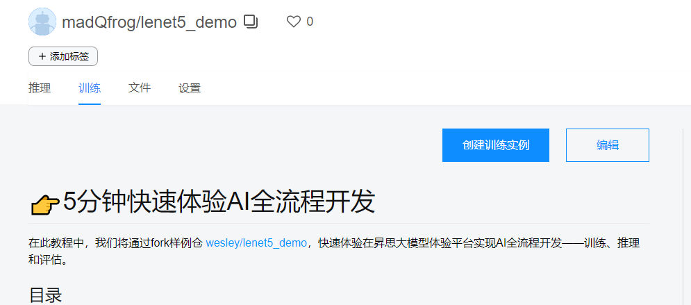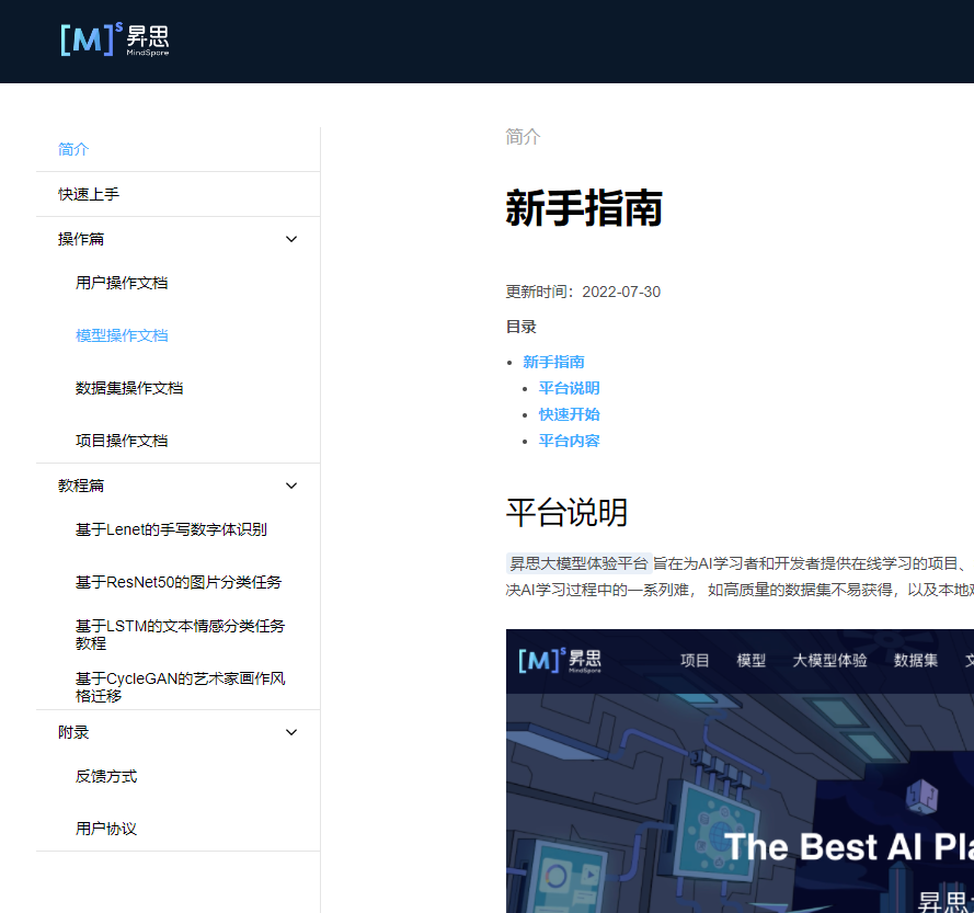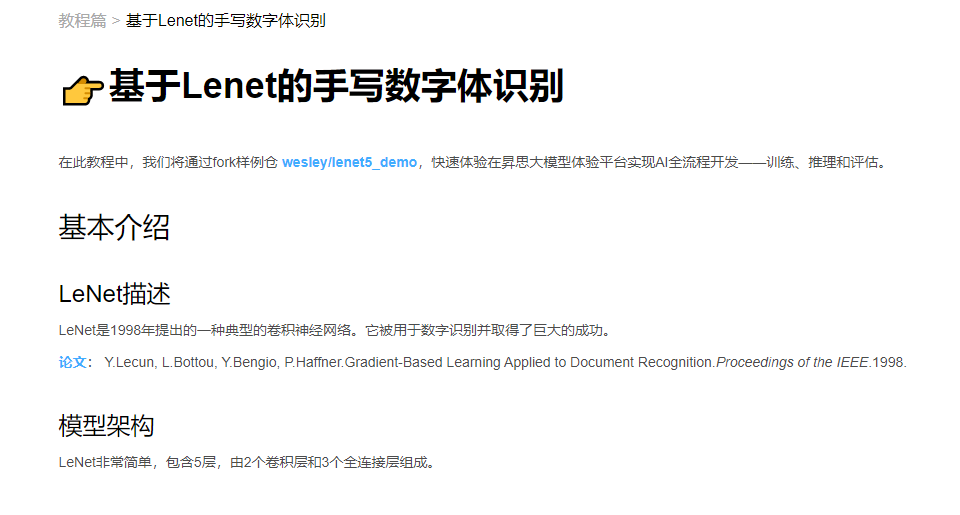 左侧有保姆级的详细文档可以参考,包括快速开始、具体的操作等等,我选择了教程篇中的“基于Lenet的手写字体识别”进行学习。