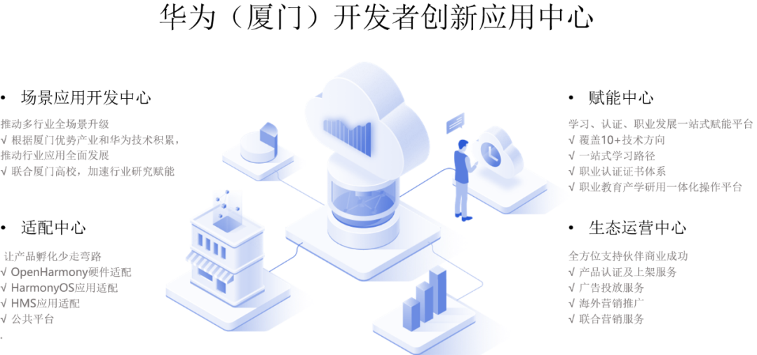 为响应国家自主可控信创产业发展战略,加快软硬件自研进程。基于鸿蒙/HMS、鲲鹏、欧拉等根技术,构建全球开发者生态,华为云将在厦门设立全国首个开发者创新应用中心。未来,华为(厦门)开发者创新应用中心将提供企业适配迁移、场景应用开发、人才培养和生态运营四位一体的服务。