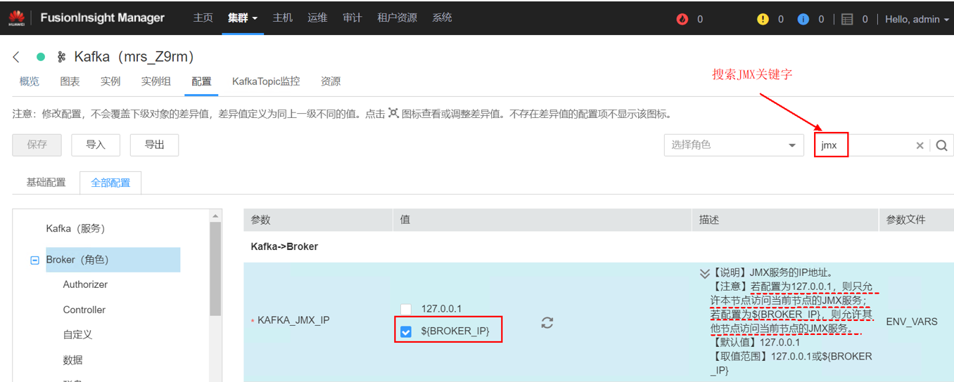 登录MRS Manager界面,如下修改配置项KAFKA_JMX_IP的值为${BROKER_IP},并保存。