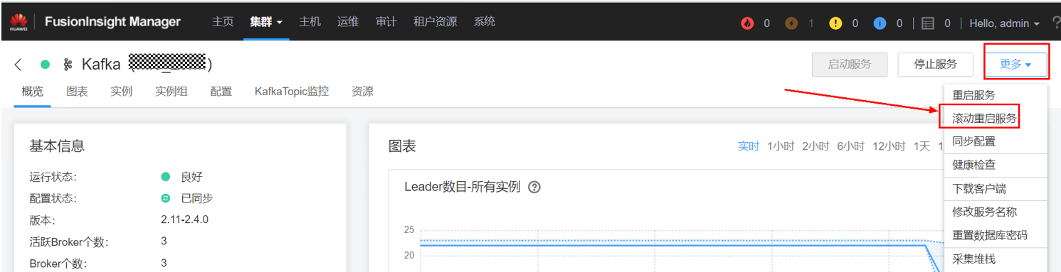 在业务低峰期,登录MRS Manager界面,如下滚动重启Kafka服务