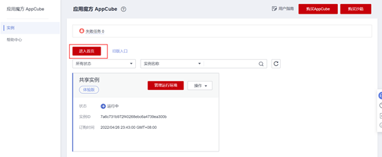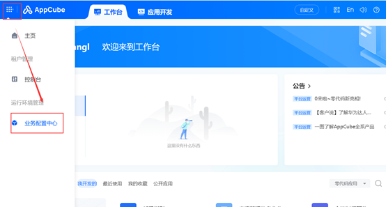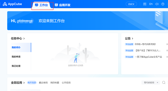 登录华为云AppCube,点击进入“首页”,点击进入“工作台”。