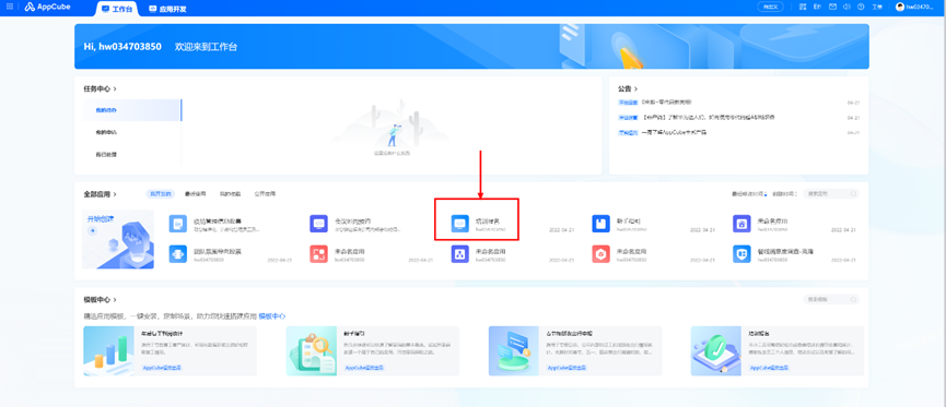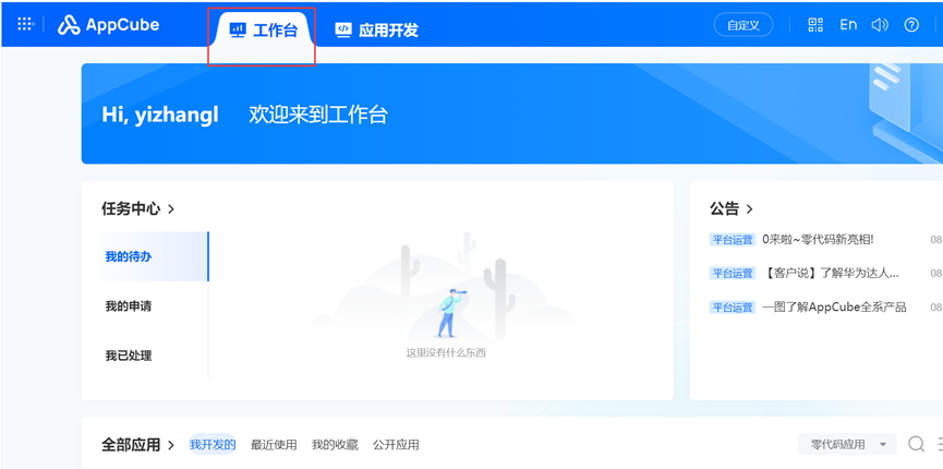 登录华为云AppCube,点击进入“首页”,点击进入“工作台”。