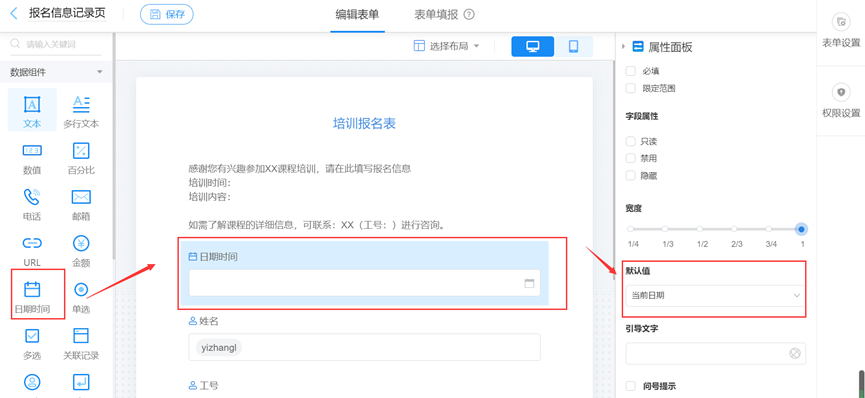 将“日期时间”拖入画布中,默认数值选择“当前日期”;操作完成后选择“保存”;