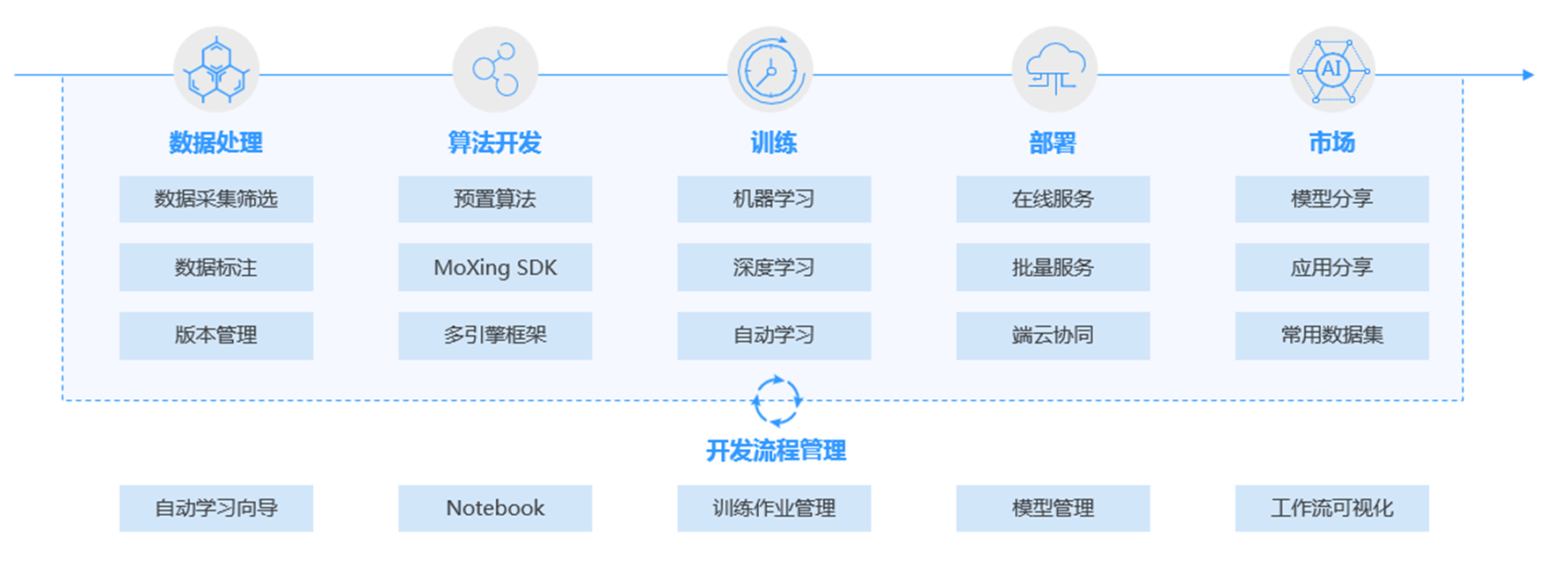 繁多的AI工具安装配置、数据准备、模型训练慢等是困扰AI工程师的诸多难题。为解决这个难题,将一站式的AI开发平台(ModelArts)提供给开发者,从数据准备到算法开发、模型训练,最后把模型部署起来,集成到生产环境。一站式完成所有任务。