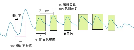 以脉搏波为例说明能量包的形态,表达能量包的参数有包峰位置、包峰间距,包峰宽度。能量包也可以叫做事件段,是在信号中具有特殊意义的一系列小段信号。