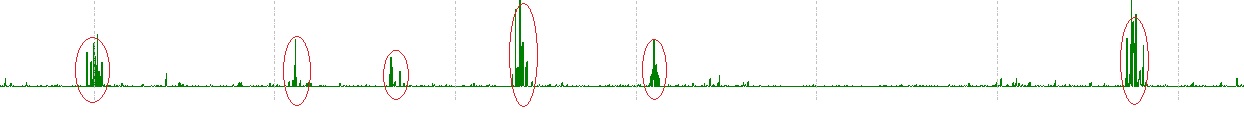 (3.5)心率事件检测:心率的采样速率为5Hz,先对心率进行平滑,平滑窗口长度为10秒(51点),然后对平滑后心率检测能量包,检测参数为:滑动窗口长度10s,最短事件长度10s,最长事件长度120s,相邻事件波峰间隔2s,不进行积分变换,输出结果形式为波形事件,下图是一段实例。