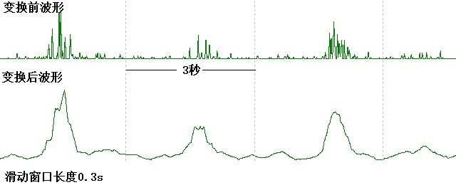 (2.3)以下是一段声音信号的局部积分前后波形,滑动窗口长度为0.1s,信号采样率为11025Hz。