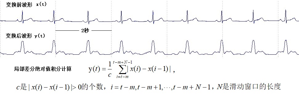 (2.1)以下是一段心电信号通过局部积分变换前后的波形,变换后的信号更加突出心电QRS波群的能量包,便于进一步进行能量包检测。变换时滑动窗口的长度为0.1秒,N是滑动窗口长度,m=N/2。