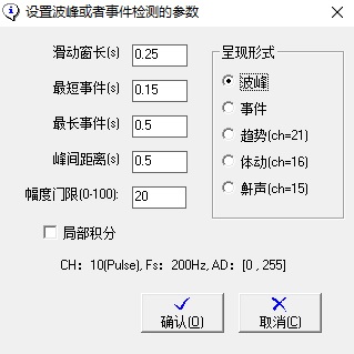 (3.2)对于脉搏波可选择如下参数:滑动窗长度为0.2s,最短事件长度为0.1s,最长事件长度为0.3s,最小峰间距为0.24s,幅度门限为20,不进行局部积分预处理,以波峰的形式标记检测结果。由于脉搏波的能量包比较明显,不需要进行局部积分预处理,因此滑动窗的长度设置也就无关紧要。