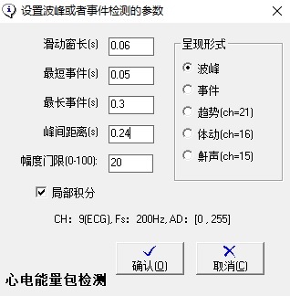 根据信号的特点,通过设置合适的参数来检测信号中的能量包(energy envelope)。菜单操作:《分析》→ 《能量包检测》,出现如下对话框,由用户输入合适参数。