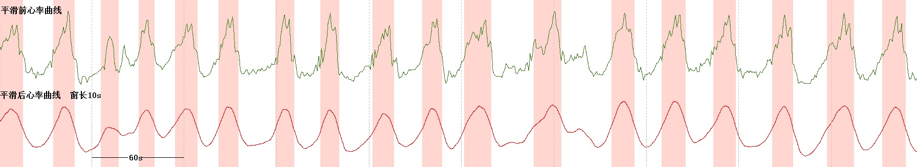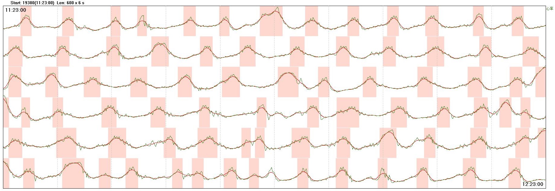 以下是一段长度为一小时的心率波形,其采样率为5Hz,采用6行回绕显示,每行10分钟,平滑前后波形重叠显示在一起,滑动平均窗口长度为10秒(51点)。心率出现的这种起伏是由于在睡眠过程中发生了阻塞性呼吸暂停,一次呼吸暂停对应一次心率的大起伏。