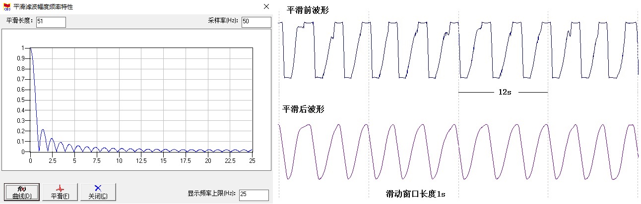 (3.3)对于呼吸波可选择如下参数:滑动窗长度为1s,最短事件长度为1s,最长事件长度为5s,最小峰间距为2s,幅度门限为20,不进行局部积分预处理,以波峰的形式标记检测结果。由于呼吸波的能量包比较明显,不需要进行局部积分预处理,因此滑动窗的长度设置也就无关紧要。但是如果呼吸波出现了饱和情况,则可以先进行平滑预处理。以下是一段饱和呼吸波平滑前后情况,平滑时滑动窗口长度为1秒,信号平滑菜单操作:《处理》→ 《奇数点平均滤波》。