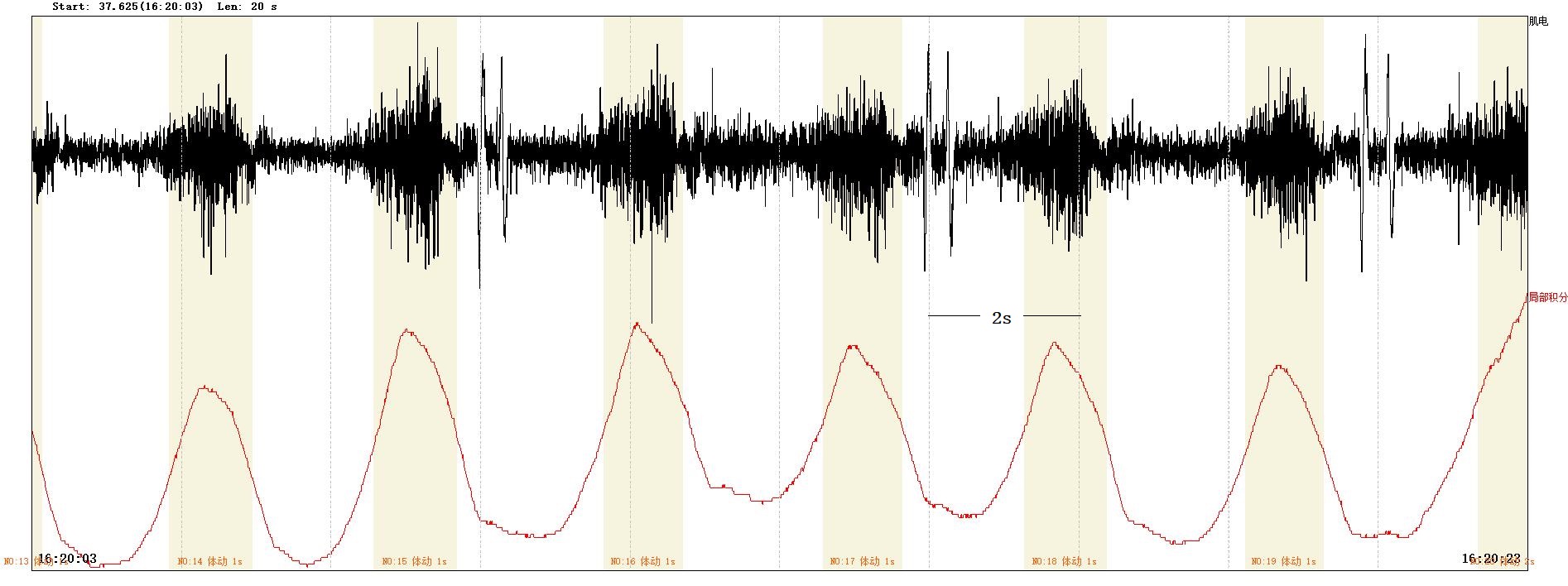 以下现实两路信号,第1路是表面肌电信号,采样率为1000Hz,第2路是表面肌电信号经过处理后得到包络,处理方法是:《处理》→《幅度修剪处理》,弹出对话框选择《局部差分绝对和》后,出现对话框输入滑动窗口长度为1秒,得到包络。基于包络信号,进行能量包检测,以事件形式表达。