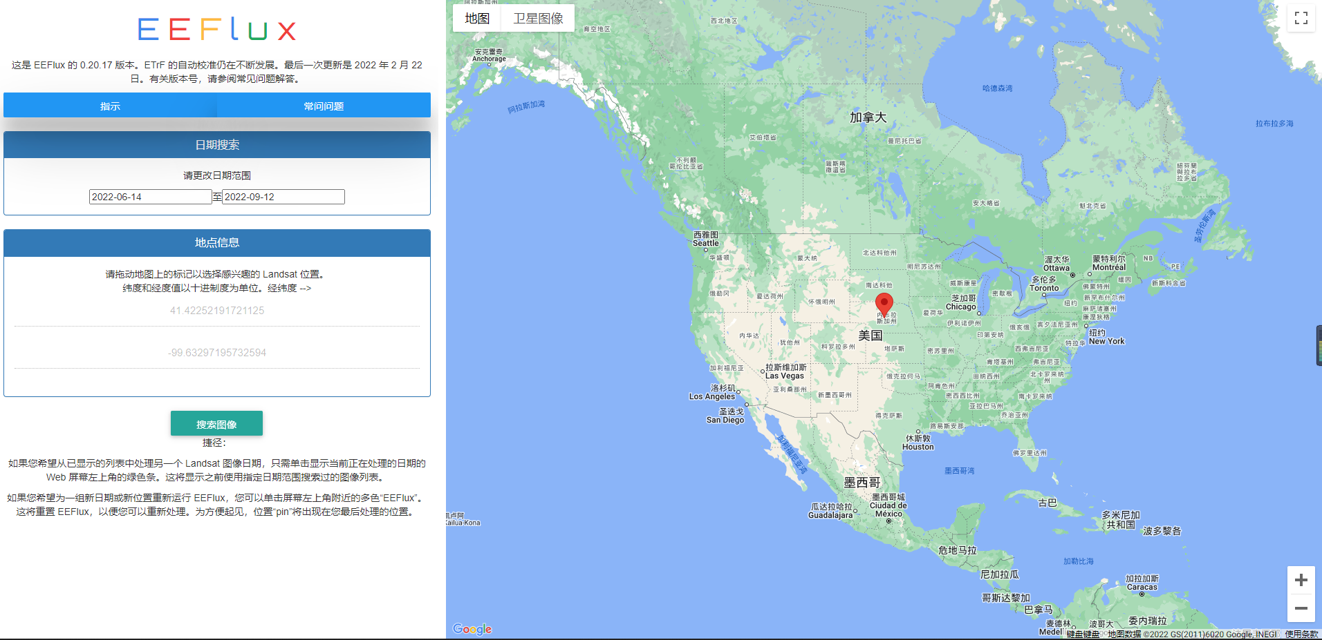 要应用 EEFlux,用户可以在日期窗口中指定搜索的开始和停止日期,然后将 Google 地图上的橙色图钉移动到感兴趣的区域。当按下“搜索图像”按钮时,EEFlux 将在 Google 档案中搜索那些驻留在日期范围内并覆盖由图钉标识的区域的 Landsat 图像。对于被两条路径覆盖的区域,将显示来自两条路径的图像。然后,EEFlux 将提供该位置的图像列表,并允许用户选择一个图像进行处理。EEFlux 一次处理一个图像(场景)(这将在未来改变)。可用图像列表包括由 USGS EROS 数据中心确定的整个场景的云量百分比评估。
