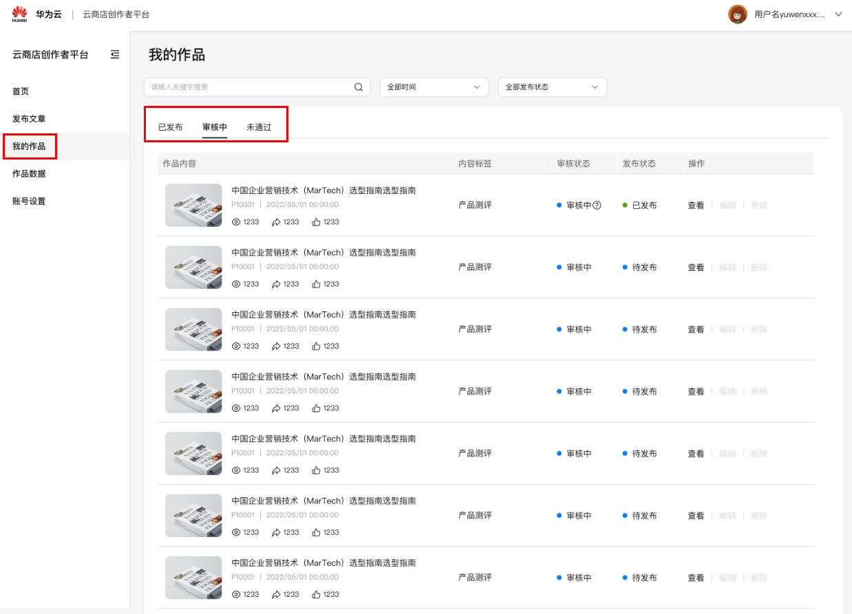 作者可对已发布或审核未通过的作品进行查看,编辑,删除等操作,对审核中的作品只能进行查看操作。